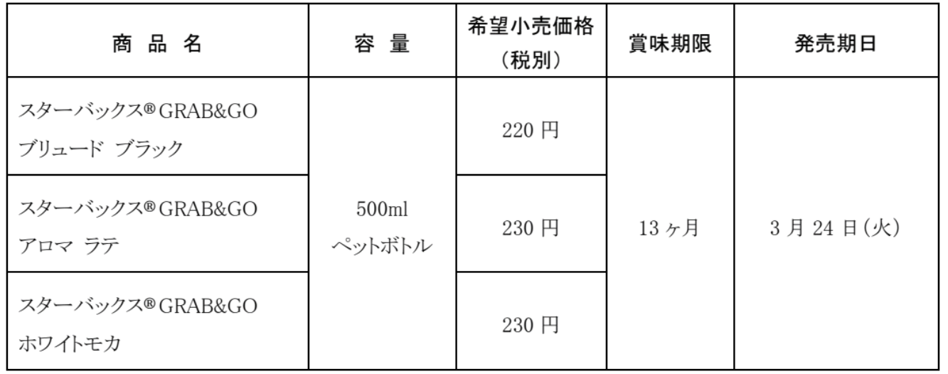 スターバックス・コーポレーション(本社:米国 シアトル、CEO:ブライアン・ニコル)と、サントリー食品インターナショナル株式会社(本社:東京都、社長:小野真紀子)は、ご好評いただいているペットボトル入りコーヒーシリーズの「スターバックス®GRAB&GO」をリニューアルし、「同 ブリュード ブラック」「同 アロマ ラテ」「同 ホワイトモカ」を3月24日(火)から全国のセブン‐イレブン限定で順次切り替え発売します。