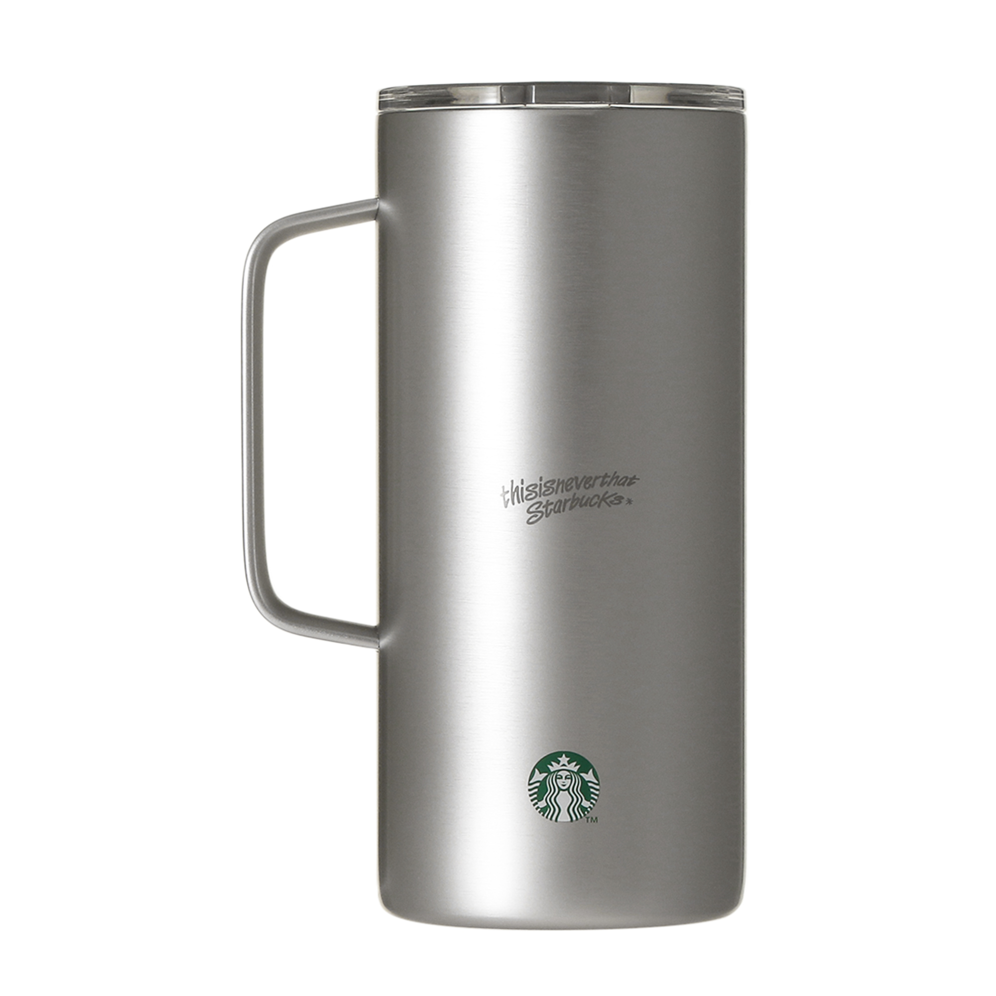 直線的な輪郭と、ステンレスを削り出したかのような見た目が特徴のステンレスマグタンブラー。thisisneverthatの本国である韓国のスターバックスで非常に人気なモデル(形状)を採用し、前面には「thisisneverthat」のロゴタイプに「starbucks」を組み合わせたオリジナルデザインを施しました。 背面には、両ブランド名がスクリプト体のタイポグラフィでさりげなくデザインされています。
