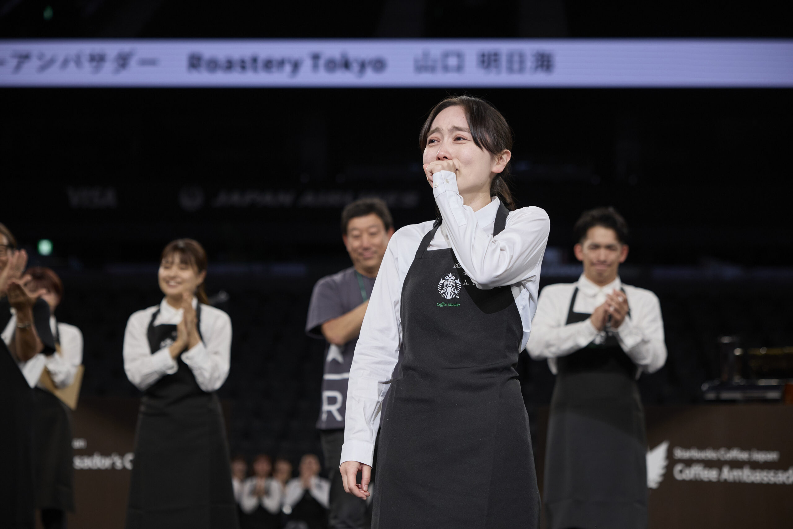 結果発表の瞬間、山口さんの名前が呼ばれると、応援に駆け付けたロースタリー 東京のパートナーたちからは歓喜の声が上がりました。山口さんはその仲間たちの姿を見つめ、目に涙を浮かべながら、喜びと感謝の気持ちを込めて深々とお辞儀をしていました。