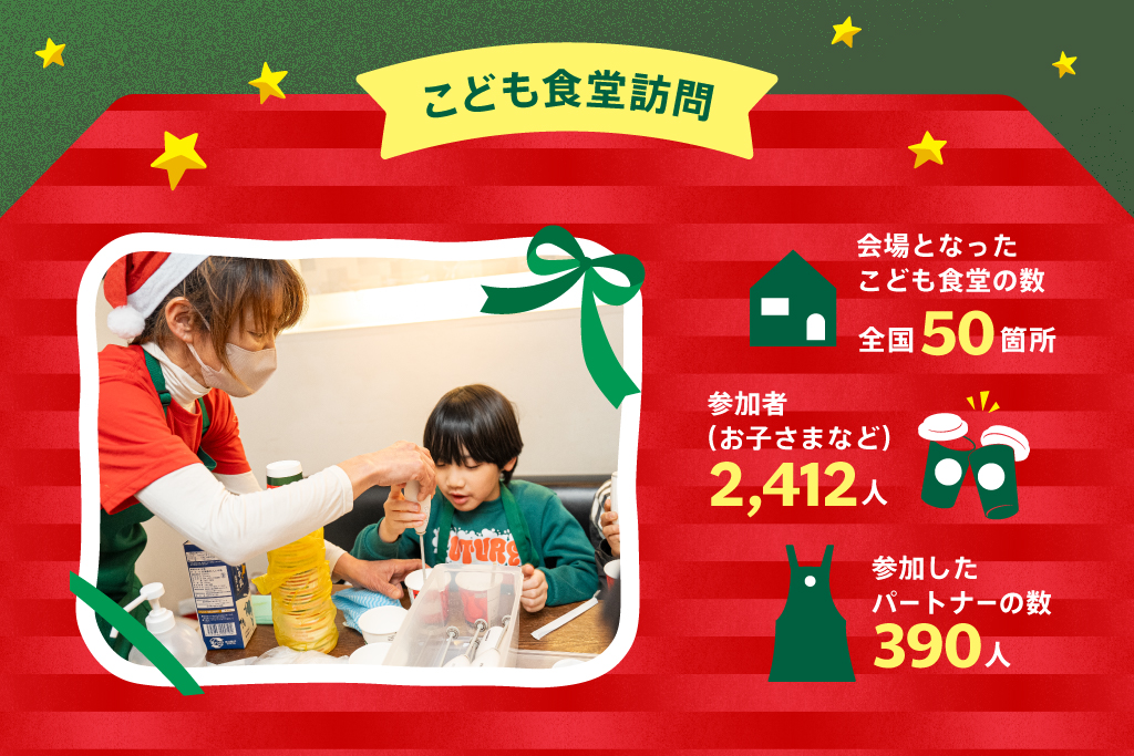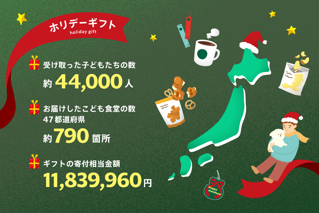 4年目となる2025年は、認定NPO法人全国こども食堂支援センター・むすびえを通じて11,839,960円相当のホリデーギフトを47都道府県、計790か所のこども食堂へお届けし、約44,000人の子どもたち、そして地域のみなさまへプレゼントすることができました。そのうち50か所にはパートナー(従業員)がサンタに扮し、直接ギフトをお届けするためこども食堂に訪問し、バリスタ体験など地域のみなさまの笑顔につながる体験を行いました。