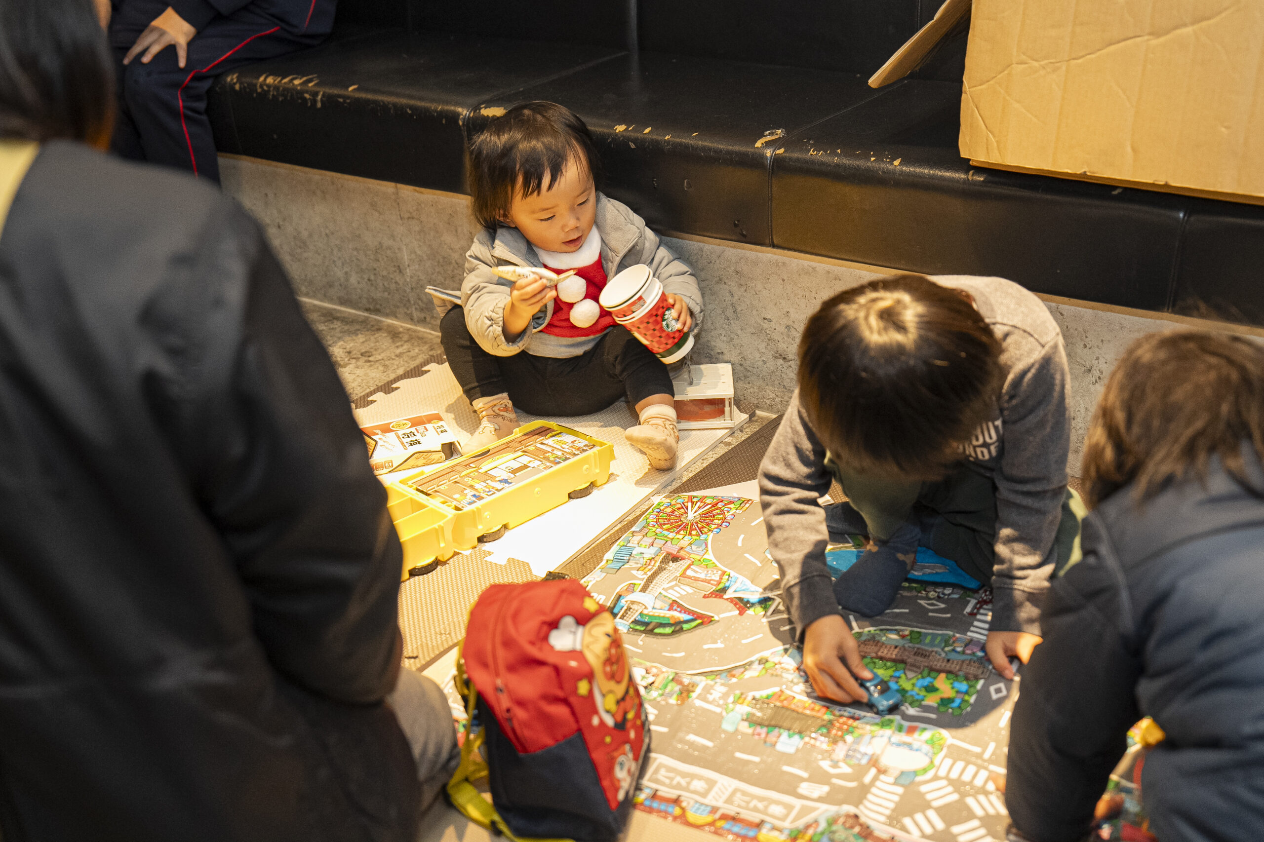 扉を開けると、店の小上がりへまっしぐらに向かい、「これこれ!」とオモチャを出す1歳・3歳・5歳のきょうだい。「大学生の方たちが子どもと一緒に遊んでくれるんです。お兄ちゃん、お姉ちゃんと遊べることをみんな喜んでいて」と、きょうだいのお母さんが教えてくれました。