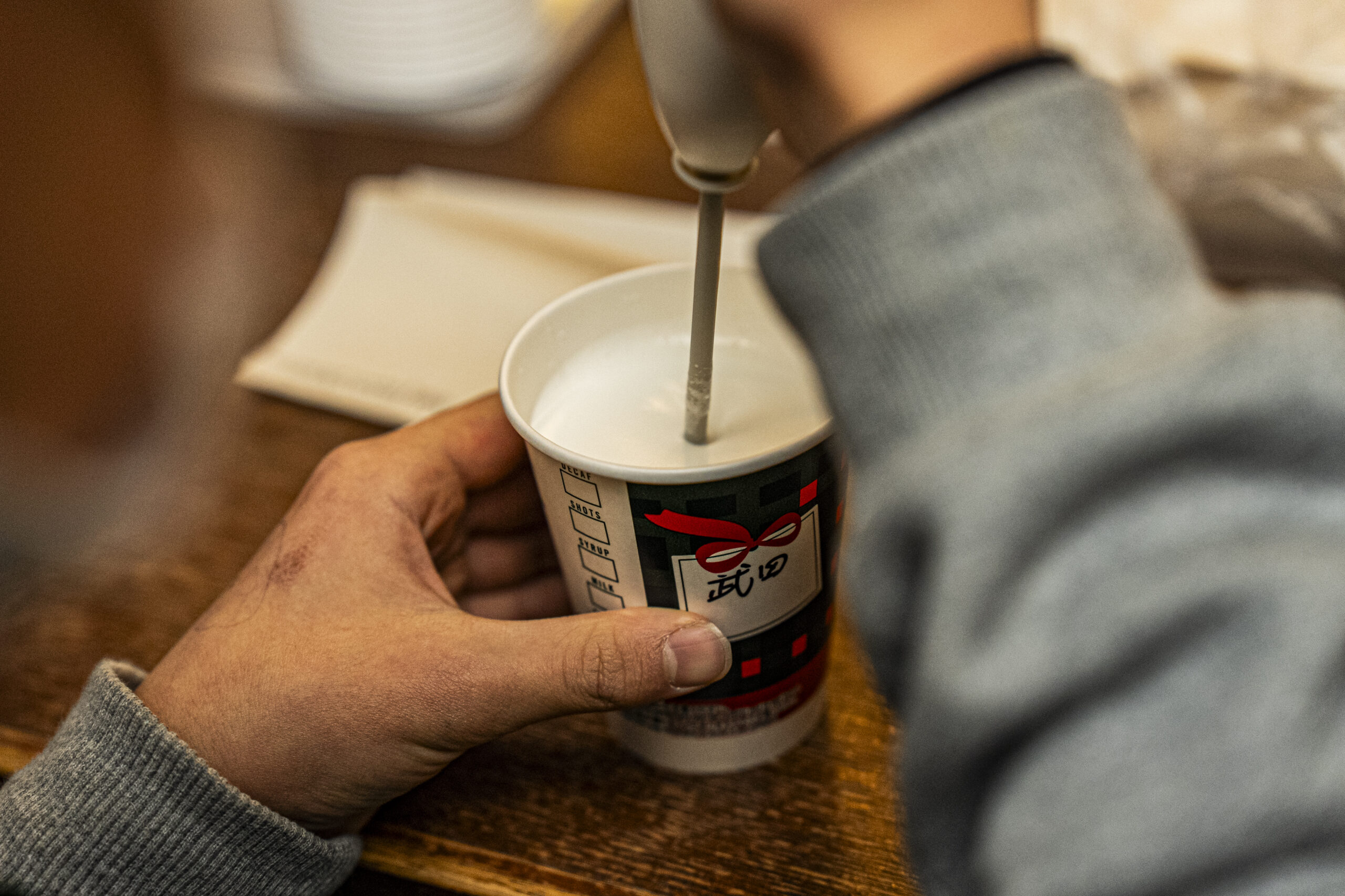 好みのフレーバーのスターバックス ヴィア®を選び、お湯で溶かします。ミルクフォーマーを使って自分で泡立てたミルクを注げば完成です。真剣な顔、ミルクが飛び散って驚いた顔、おいしい~と満足そうな顔――くるくる変わるみんなの表情が印象的でした。
