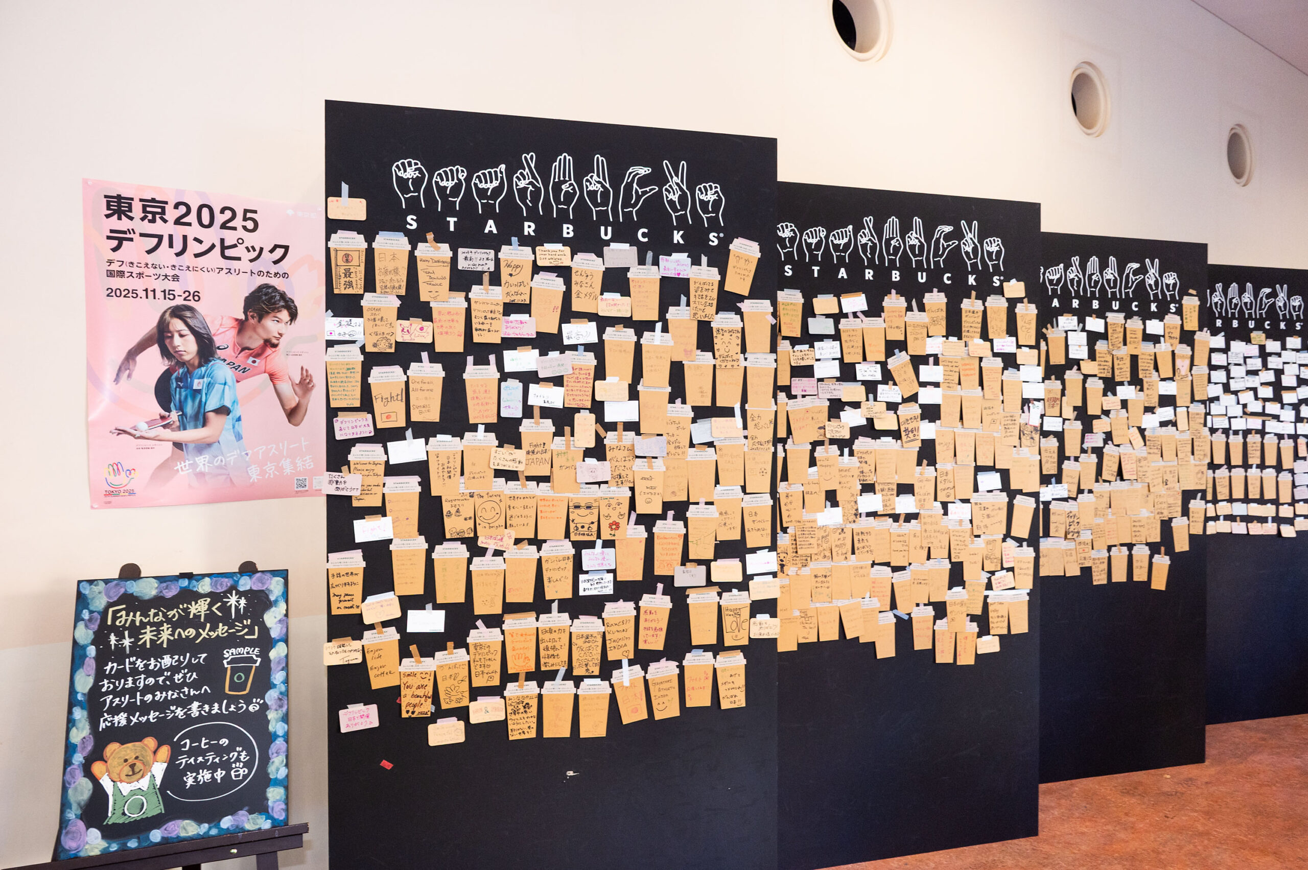 ポップアップストアでは、コーヒーのテイスティングを実施したほか、アスリートへの応援メッセージボードを設置。「いっぱい輝いてください」「手話を使う使わない関係なく、応援します。分断しません」「頑張っている姿が美しい!ありがとう」など、来場者から集まった6,000件以上もの温かな言葉であふれていました。