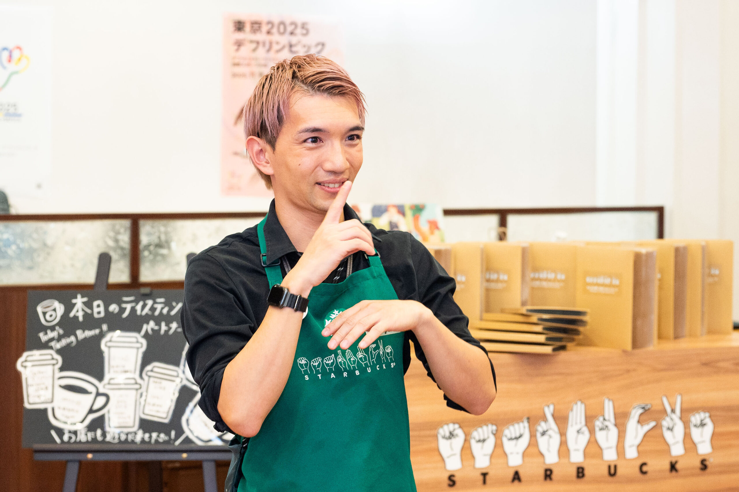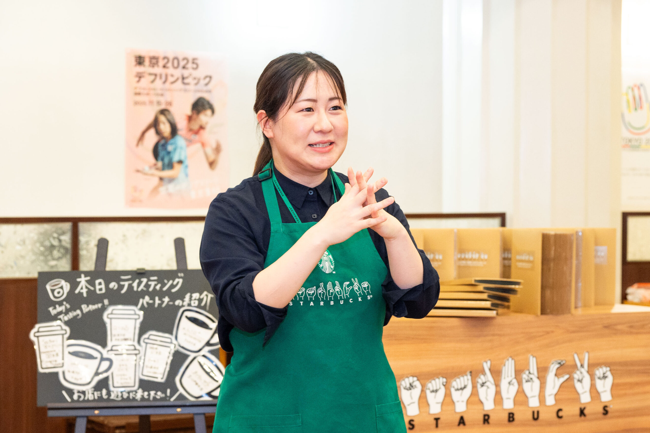 デフリンピックに関わりたいと参加を決めた、新橋駅前店の松原さん。普段のお店では後方支援を担当していますが、ポップアップストアではコーヒーを配り、手話で会話し、お客様との交流を積極的に楽しみました。そして、手話カフェを開いているパートナーの話など仲間から刺激を受け、「ここで学んだことを生かし、自分の店でも手話カフェを開けたら」と前向きな気持ちになったと語ります。