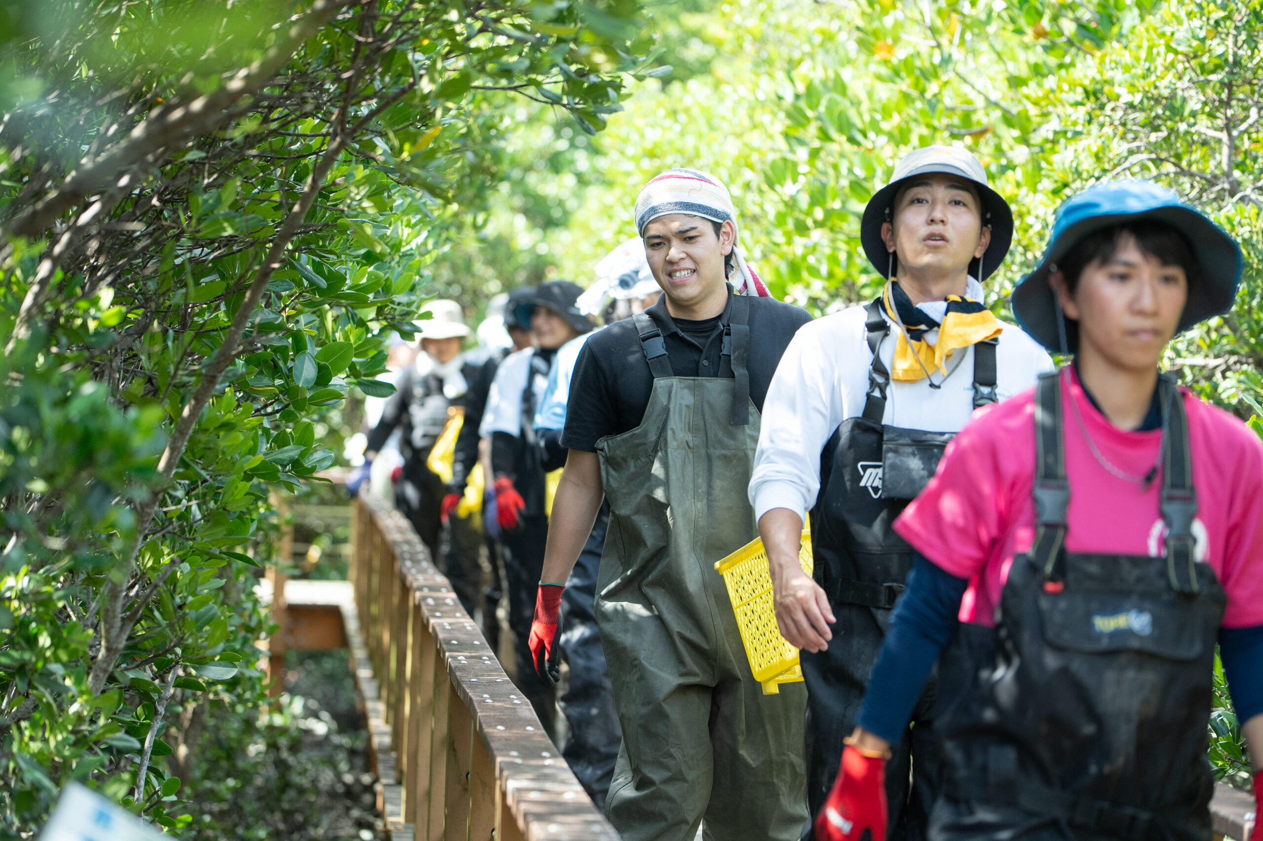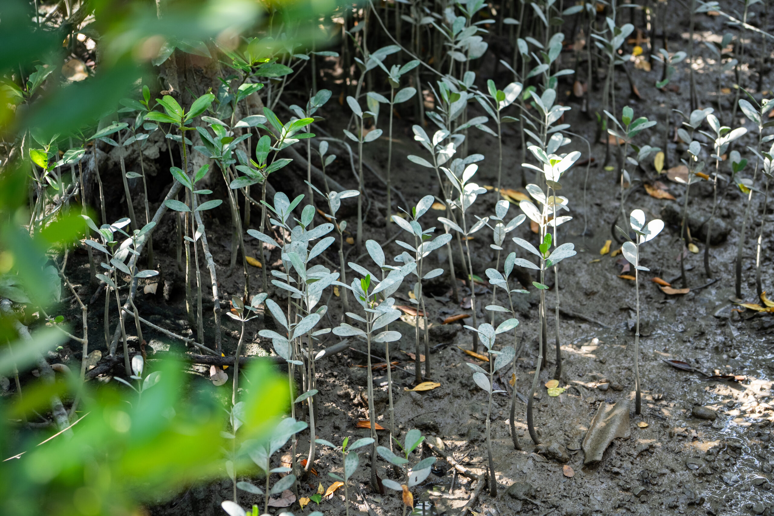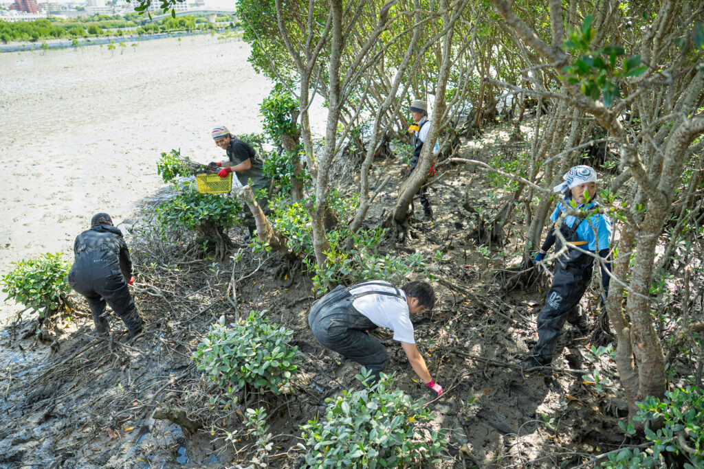 パートナーを含めワークショップの参加者は、胴長長靴と手袋を装着して木道から干潟へと降り、生い茂るマングローブ林の中へ。根元には、たくさんの稚樹が首を伸ばし、周りの水場にはハゼなどの生物が見られます。