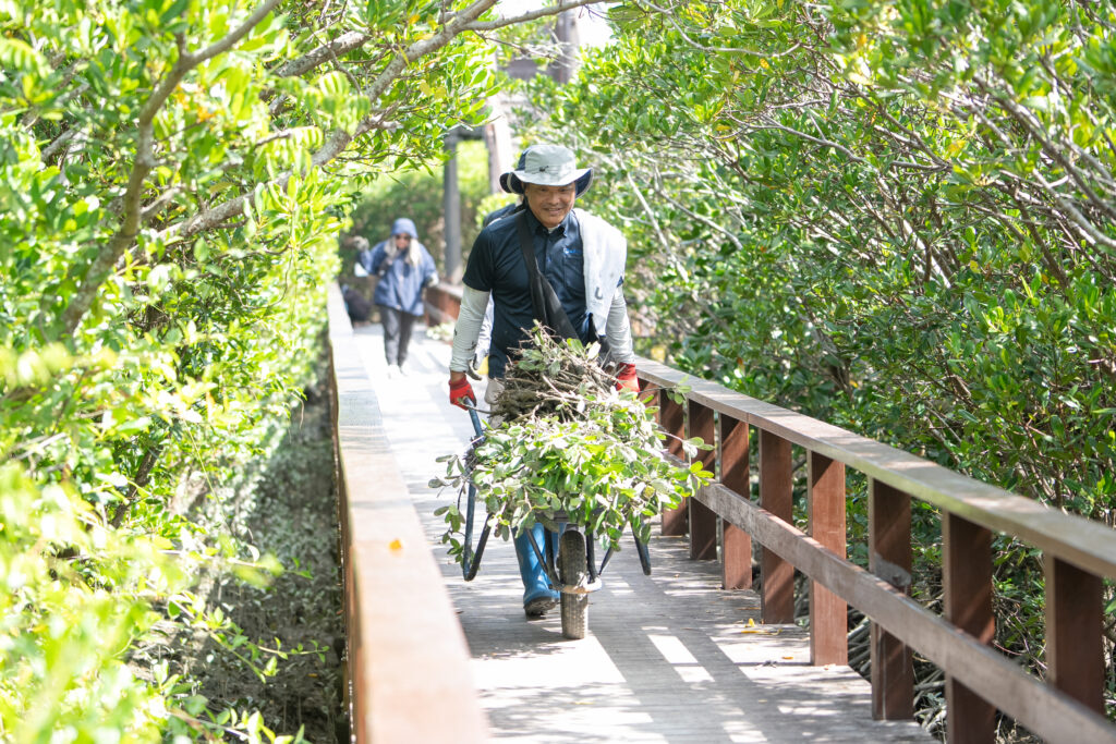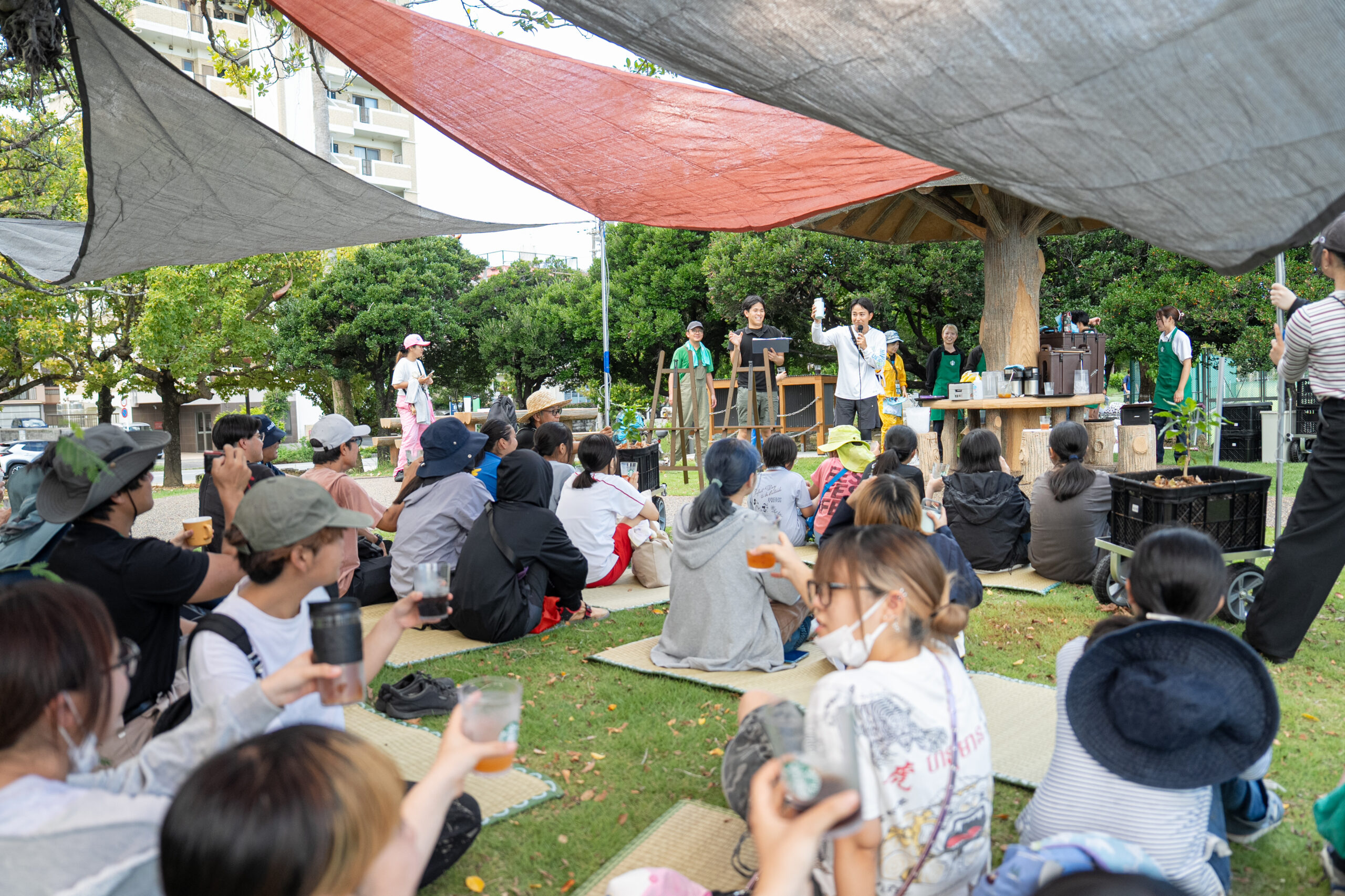 今回のワークショップでは、マングローブ稚樹抜き体験や、採取した稚樹とスターバックスのコーヒー抽出後のコーヒーかすを材料にした、たい肥づくりの実験などを実施。実行サポートとして那覇市協働大使「たのしむぞ06(おろく)」、沖縄県立芸術大学美術工芸学部と琉球大学の学生有志も加わり、小学生から大人まで地域住民やスターバックスのパートナー(従業員)ら60名以上が参加しました。