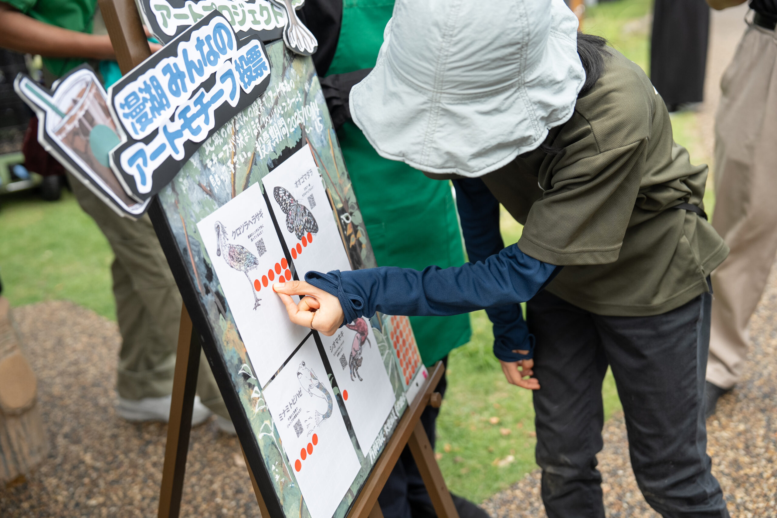 制作するアート作品のモチーフは、漫湖水鳥・湿地センターや那覇鏡原店に訪れた人による投票で、クロツラヘラサギ、オオゴマダラ、ミナミトビハゼ、シオマネキの4種から2種を選びます。沖縄県立芸術大学美術工芸学部の学生が手掛けた投票ボードに、イベントの参加者も投票しました。
