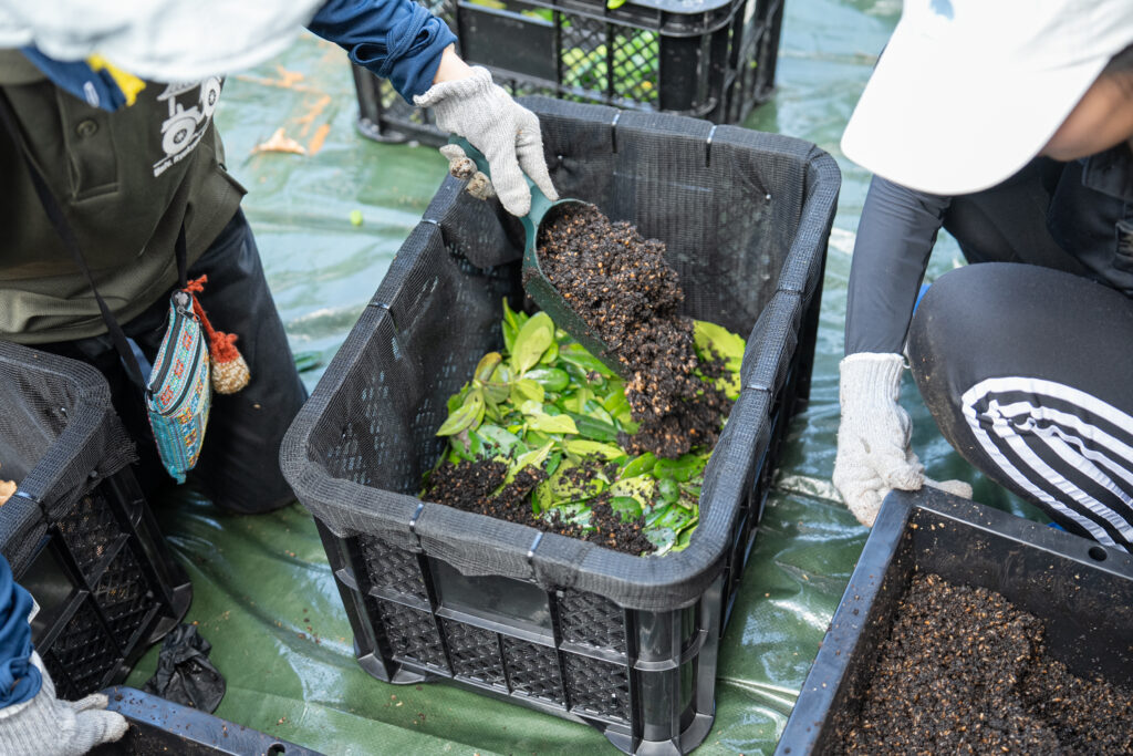 抜いた稚樹は漫湖水鳥・湿地センターへ運び、泥を洗い流して葉だけを那覇鏡原店へと運びます。ここでは抜いた稚樹をたい肥に活用する実験として、マングローブの葉をコーヒーの豆かすと混ぜました。今後は店舗前のコンポストで、発酵の様子を見守っていきます。